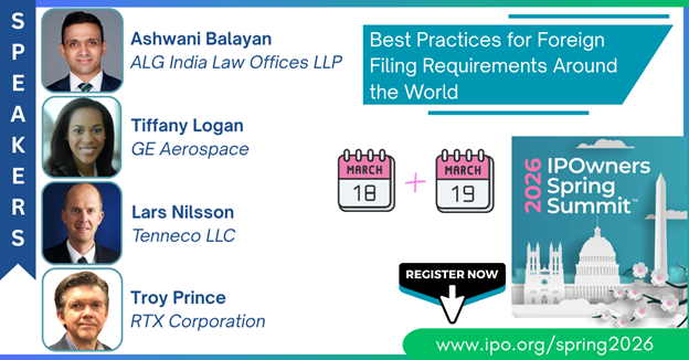 Register to attend IPOwners Spring Summit™ on March 19 in Washington, DC and attend a session on “Best Practices for Foreign Filing Requirements Around the World,” organized by IPO’s European Practice, Asian Practice, U.S. Patent Office Practice Committees. Various countries around the world require Foreign Filing Licenses to be issued before filing patents outside their jurisdictions. However, it is now very common for patent applications to be filed on behalf of multiple inventors that reside in multiple different countries. Penalties for failure to obtain a foreign filing license can range from loss of patent rights to criminal sanctions for inventors. Speakers will provide an update as to the Foreign Filing License requirements for various nations around the world and to discuss best practices when it comes to international filings and obtaining Foreign Filing Licenses. Visit the website to view the full program or to register.