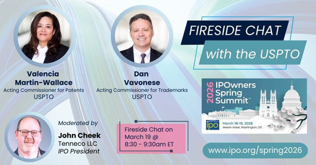 The USPTO’s Acting Commissioners for Patents and Trademarks will participate in a fireside chat during IPO’s IPOwners Spring Summit™ on March 19 in Washington, DC. IPO President JOHN CHEEK (Tenneco LLC) will moderate the discussion. They will discuss backlogs, quality, technology, and other developments at the USPTO. Visit the website to view the full program or to register.