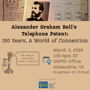 IPO is cosponsoring a March 5, 2026, program at the USPTO commemorating the 150th anniversary of Alexander Graham Bell’s telephone patent and examining the role of intellectual property in advancing communications innovation. The hybrid event, titled “Alexander Graham Bell’s Telephone Patent: 150 Years, a World of Connection,” will be held at USPTO headquarters in Alexandria, Virginia, and will also be available virtually.