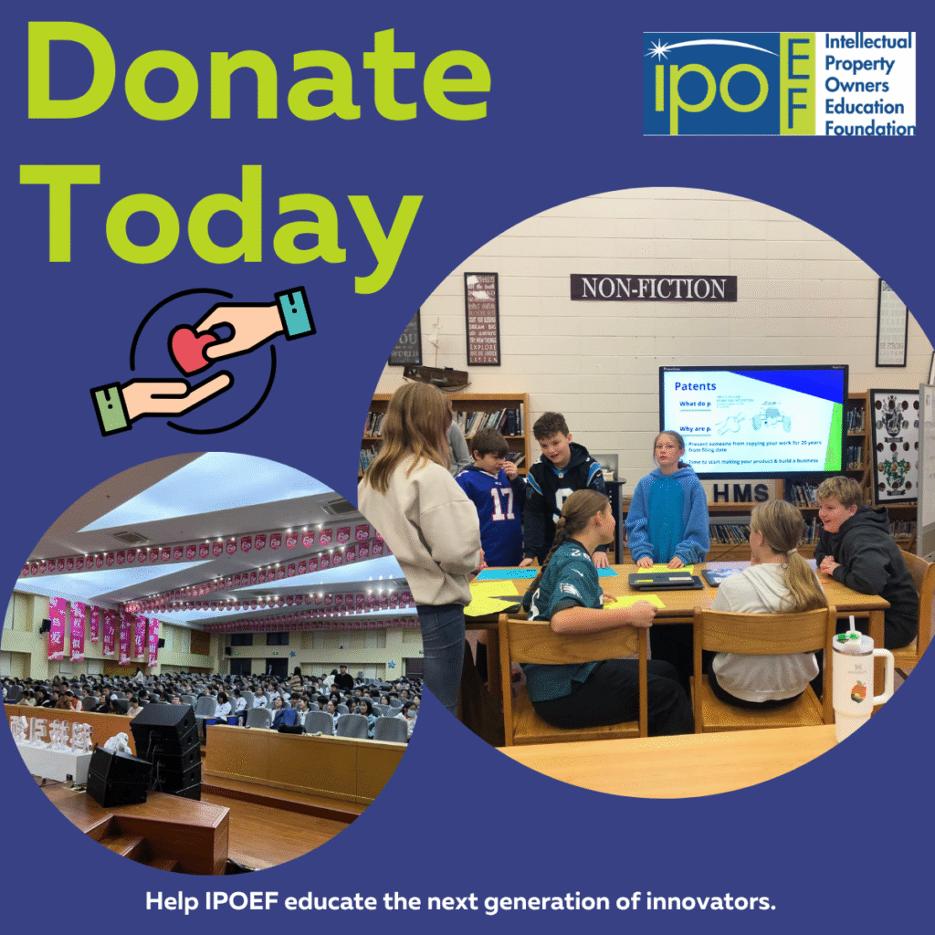 Today is the last day of IPOEF’s Spring Fundraising Campaign. Help us reach our goal of raising $15,000 by donating today! Your donation helps us reach a larger audience and scale our IP education resources like IP Buddy, IP Made Easy, and the Next Gen Innovators toolkit. With your support, we can make an impact on the next generation and shape their understanding of the importance IP plays in driving innovation. Every donation helps us make this impact!