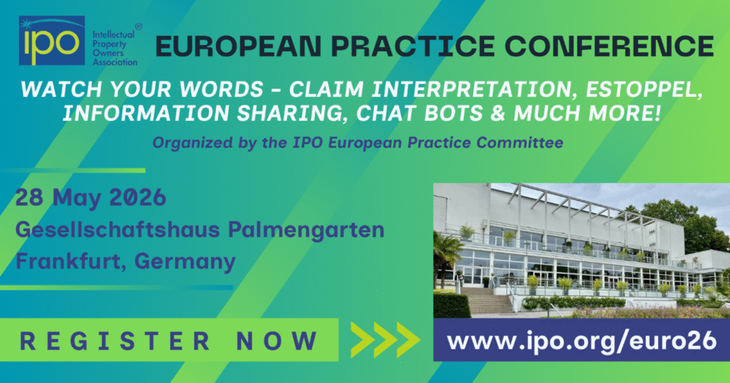 For the 13th year, IPO’s European Practice Committee is organizing a conference entitled “Watch Your Words – Claim Interpretations, Estoppel, Information Sharing, Chat Bots and Much More.” The 2026 event will take place on 28 May at Gesellschaftshaus Palmengarten in Frankfurt, Germany. Topics include AI tools for IP professionals; information sharing; update from recent EU IP files; claim construction; and doctrine of equivalents, waiver and estoppel. The conference includes presentations from in-house and outside counsel as well as experts from the courts. Visit the conference website for more information or to register.